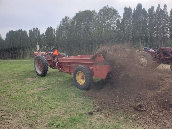 April 15 2022. Spreading mushroom compost on the garden beds using a manure spreader which worked very well. |