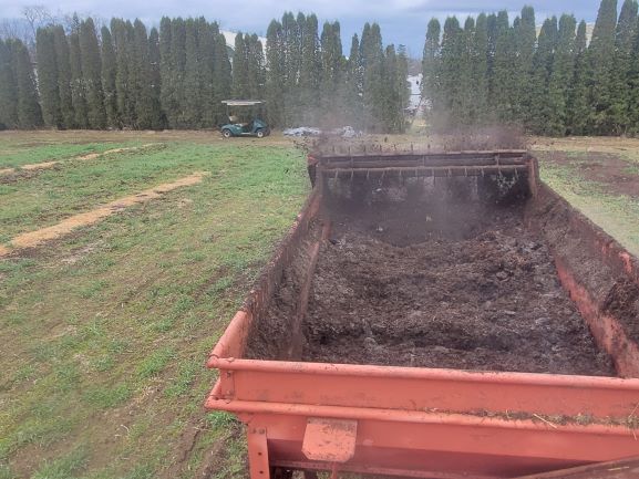 April 3 2022. I have long wanted to do more composting but never figured out a way to do it until lately. Just fill the manure spreader with material and then let it mix the contents to make windrows. |