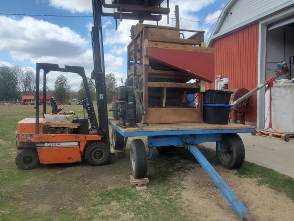 April 17 2022. Finally got the Clipper seed cleaner working well. Here I am cleaning sunflower seeds that I harvested last fall. The Cleaner is run by a small diesel engine which took some time to get all the correct sizes of pulleys to make it run well. |