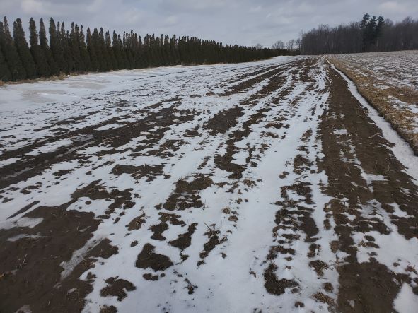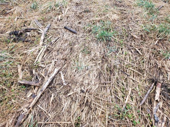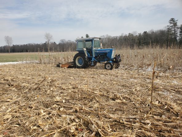 March 5 2022. The weather was warm but the ground still frozen so the tractor was able to bush hog the corn stocks giving a nice mulch for the microbes, |