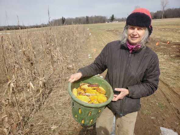March 5 2022. As I was bush hogging the corn stalks Dorothee was picking the last of the corn for the animals and our corn meal. |