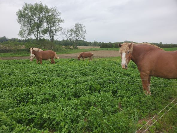 June 10 2022, The red clover did very well so I let the horses eat it. My idea is to have the horses eat the red clover and later in the fall combine it for seed. |