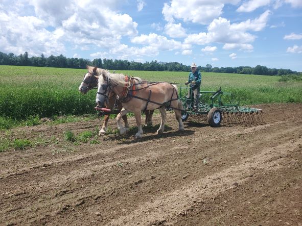 May 30 2021. Decided to get the horses out and do the last minute discing to discourage the weeds before planting the corn. I purchased a rolling basket which I welded up and attached to the horse drawn disk which works well. I would rather do more planting with the no till drill but that's for next year and better planning on my part. |