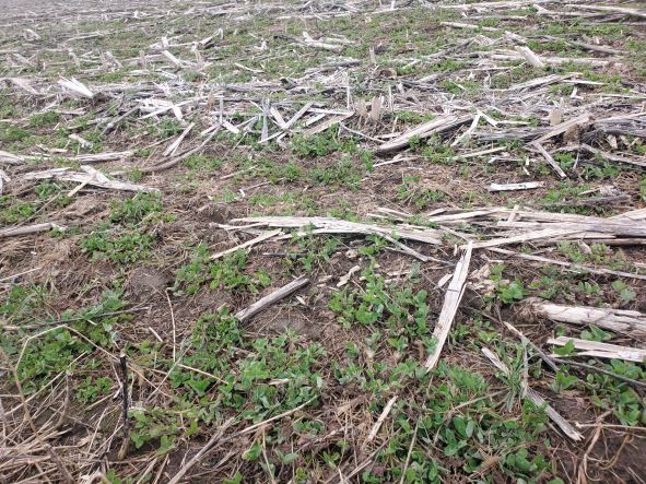 April 15 2022. Looking down the last season cultivated sunflower field showing the red clover coming on strong shown below closeup.