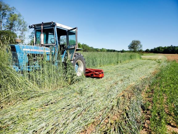 May 27 2021. Crimped the rye. It did look like a very good stand but there were some thin spots. Will plant the sunflowers in a couple of days after the rain. |