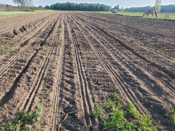 Since “plan A “ winter kill residue did not work well I had to resort to plan B which was to plow the field. This left a very bumpy field because of all the roots which I then packed with the crowfoot packer pulled by the horses. Once that was somewhat leveled I then disc'd it lightly with the horse drawn disc with rolling basket. When the horse gave up I continued with the tractor disc and rolling packer. Then I followed that with the horse drawn tyne weeder and then on certain fields like my oats I used an aggressive rotary hoe on the tractor.