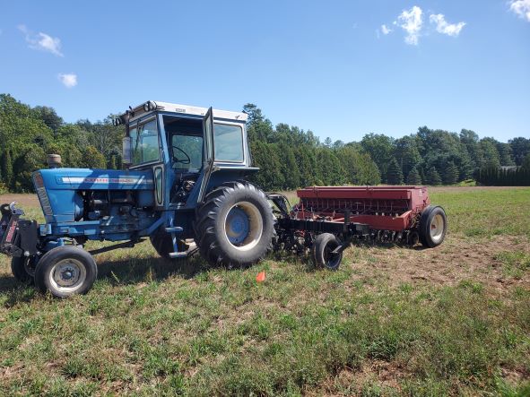 Sept 10 2021: Using the coulter cart and seed drill to over seed the pasture. |