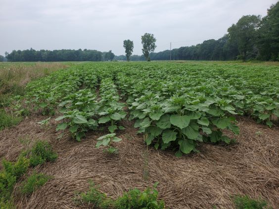 Early August in the crimped rye/ sunflowers. Very pleased with the growing white clover in the crimped rye. Sunflowers look good too! |
