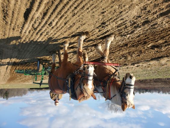 Oct 8 2024. Time to get the horses out and start plowing. I am just starting the plowing. Both the horses and myself take a little time to get a straight line and I feel rusty at the reins too. WE are oping this will be a camelina field but as with last year the very variable weather may make this not possible. |