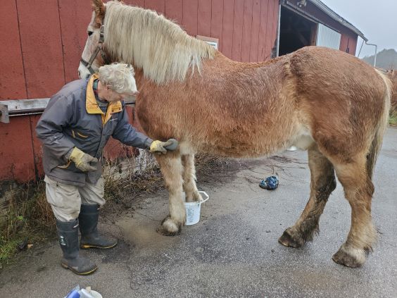 Jan 4 2024. Jim got an abscess on his hoof so we soaked it then wrapped it with an Epson salt solution. |